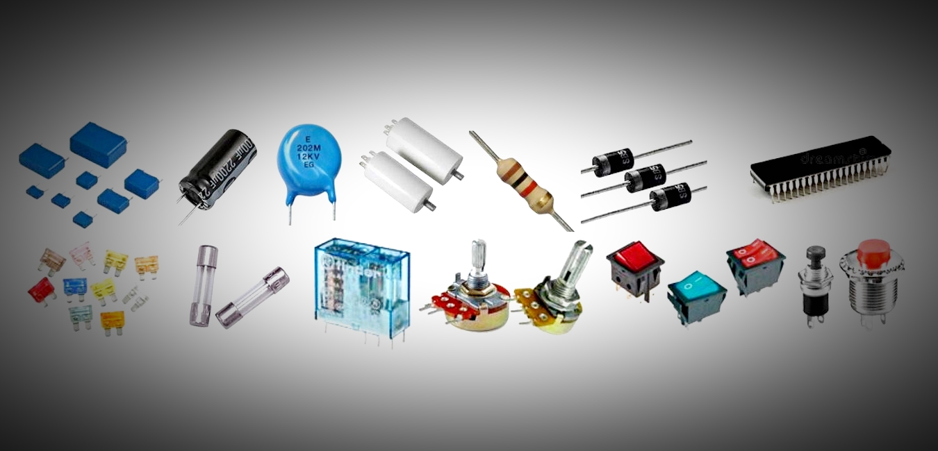 Componentes elétricos como interruptores, disjuntores, tomadas e conectores sobre superfície branca