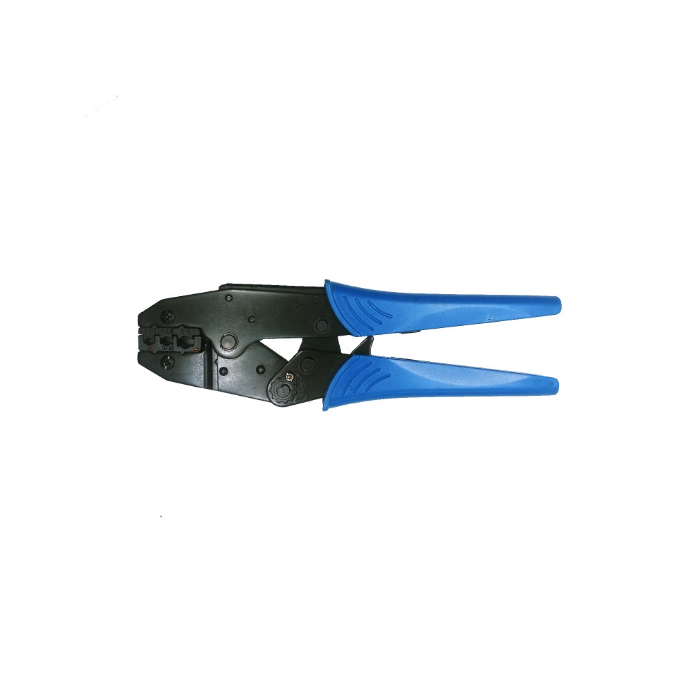 Alicate de crimpar metálico com cabos azuis e fundo branco