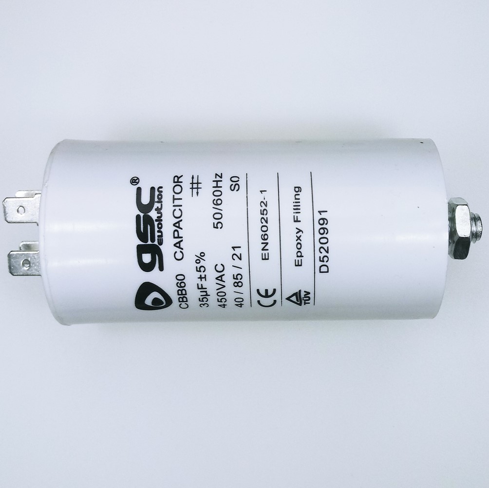 Capacitor branco cilíndrico QSC CBB60 com especificações técnicas impressas