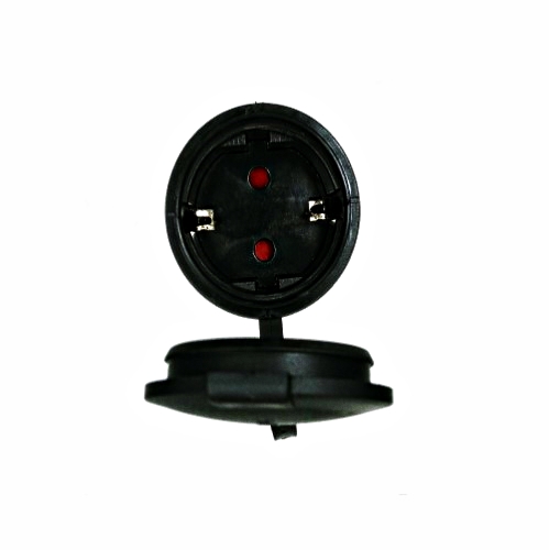 Tomada elétrica preta com tampa aberta sobre fundo branco
