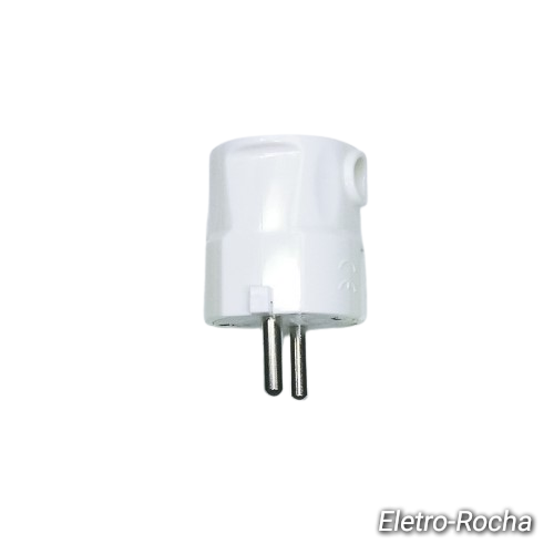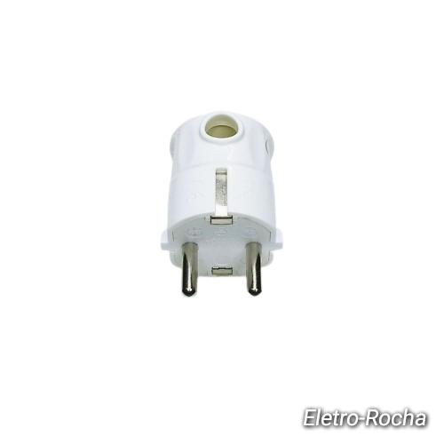 Plugue elétrico branco com dois pinos redondos e aterramento