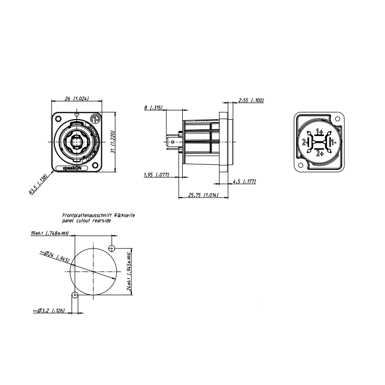 Ficha painel speakon macho 4 polos - NEUTRIK
