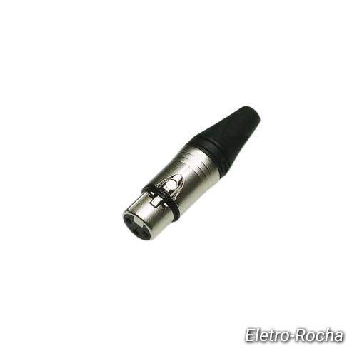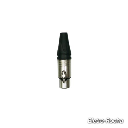 Conector XLR metálico prateado com capa preta sobre fundo branco