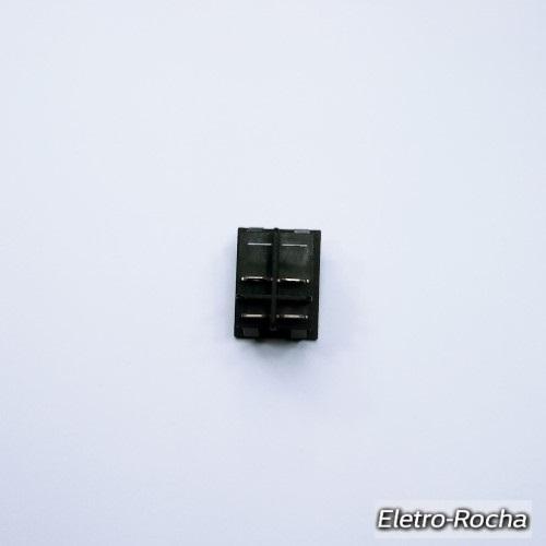 Conector elétrico preto com quatro terminais metálicos sobre fundo branco