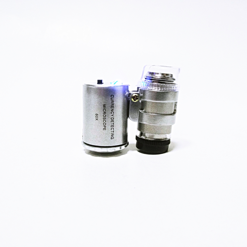 Microscópio portátil metálico prateado com lentes e texto 'CURRENCY DETECTING MICROSCOPE 60X' sobre fundo branco