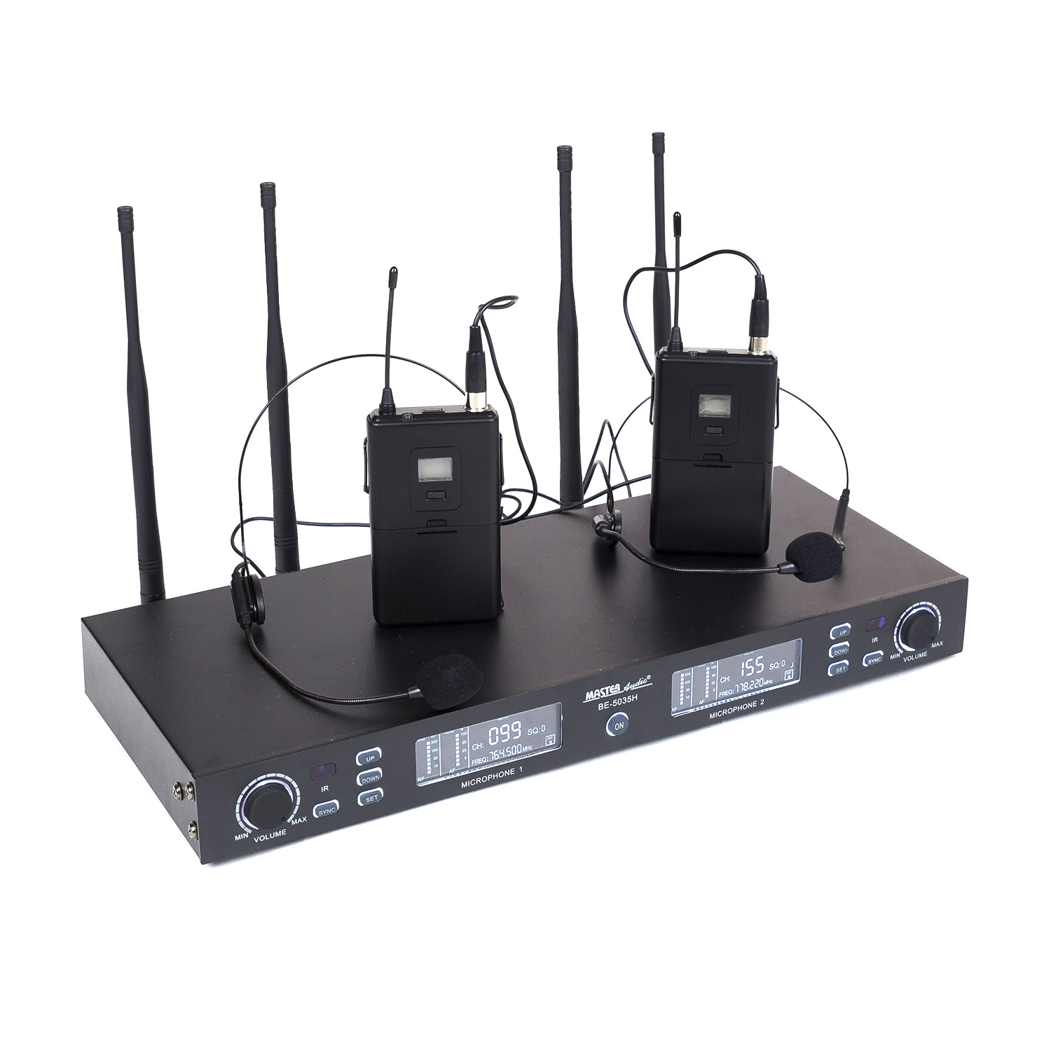 Sistema sem fio UHF de canal duplo , completo com dois transmissores auriculares com LCD.